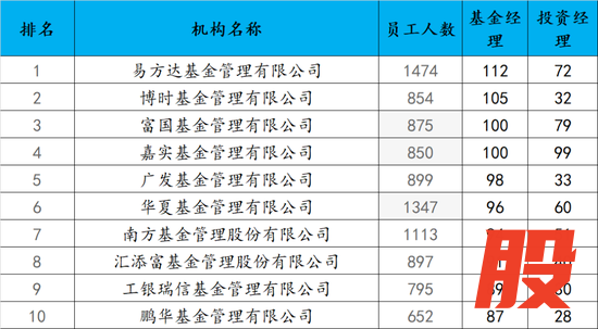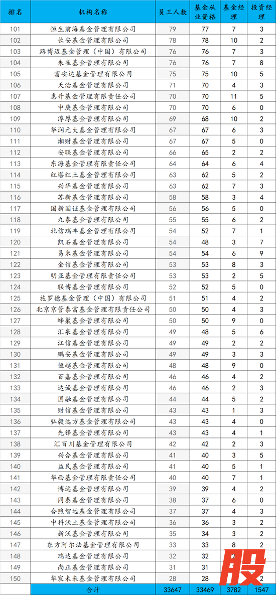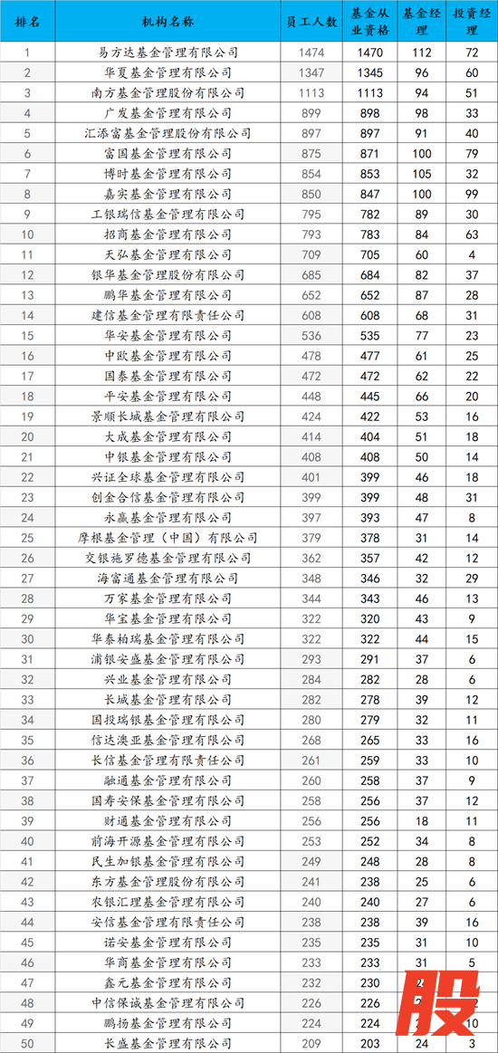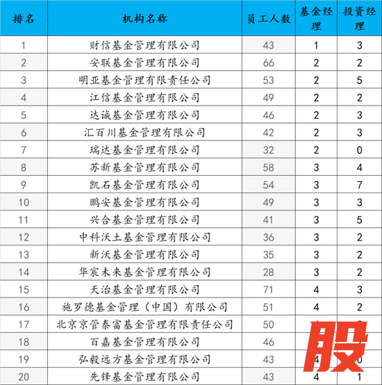 榜单末尾的基金公司,员工人数多在50人以内,如弘毅远方基金(43人)、先锋基金(43人)等。