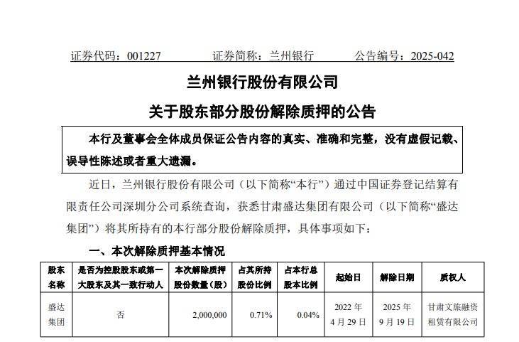 此外,公告还披露了截至2025年9月19日的股份质押相关数据:盛达集团与盛达资源合计持有的兰州银行未质押股份数量为3.36亿股,在这部分未质押股份中,1.76亿股为首发前限售股,1.60亿股为可流通股。
